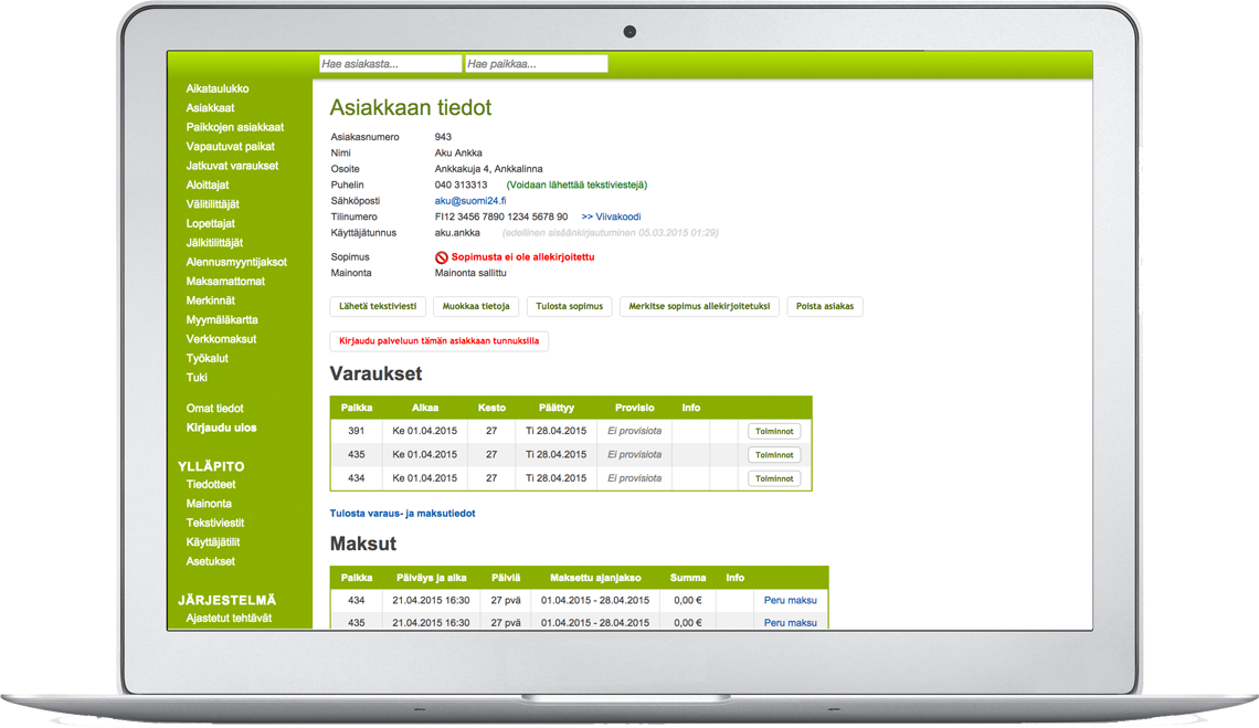 Sähköinen asiakasrekisteri säilöö kaikki asiakkaat ja näyttää yhdellä sivulla asiakasta koskevat tiedot kuten yhteystiedot, varaukset, maksut, velat, myynnin seurannan ja tapahtumahistorian.