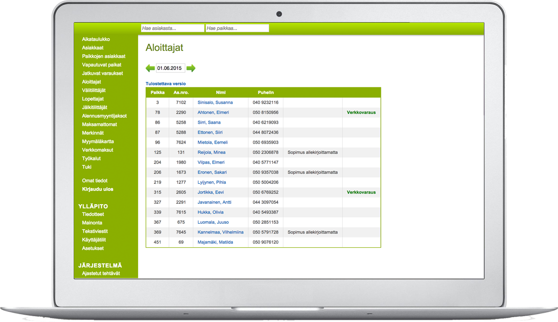 Järjestelmä voi lähettää asiakkaille automaattisia muistutuksia varausten alkamisesta tai maksuista sähköpostilla tai tekstiviestillä.